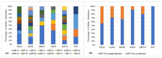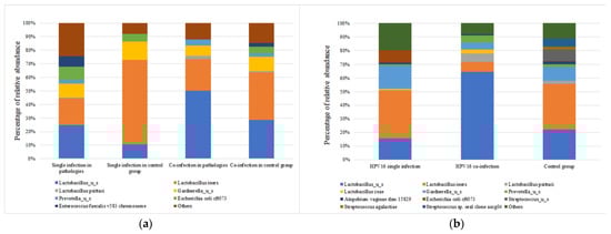 (a) Taxa relative abundance (%) in individuals with a pathological (abnormal cytology result) and control group related to HPV infection: single or co-infection. (b) Taxa relative abundance (%) in individuals with HPV16 infection (single or co-infection).