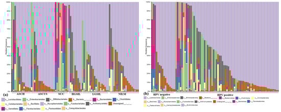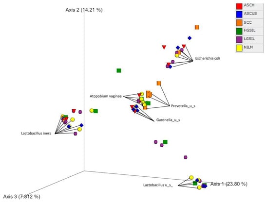 This suggests that the composition of the cervical microbiota in NILM and HPV-negative individuals consists of bacteria that are more phylogenetically distant, albeit present in low abundance (Supplementary Materials—Figure S1).