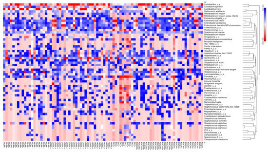 Heatmap of relative microbiome abundance found in vaginal samples obtained from women included in this study through 16S rRNA gene sequencing. Row hierarchy clustering was performed calculating the Euclidean distance based on hierarchical analysis to identify and order the most prominent taxa related to the microbiome profiles.