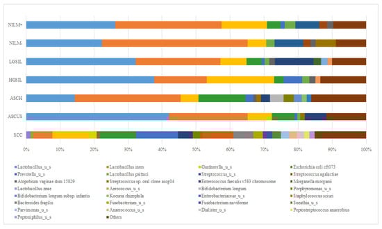 Gardnerella_u_s was predominantly detected in women with HGSIL (19.78%), followed by women with positive NILM results (13.43%) and SCC (12.98%) cases (Figure 5). Prevotella_u_s was primarily identified in SCC-positive samples (12.36%) and HGSIL samples (5.45%), while its presence in other groups was nearly negligible. Additionally, other species were also identified: Escherichia coli cft073, which was found in ASCH and SCC samples (13.80% and 11.62%, respectively), and Enterococcus faecalis v583 chromosome, which was detected in women with LGSIL (11.34%) and ASCUS (6.36%) results.