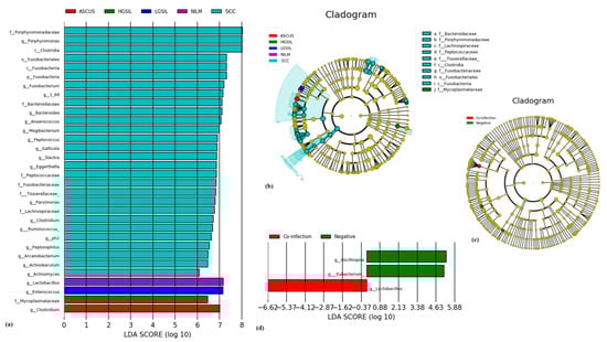 An LEfSe modeling approach was employed, revealing 33 differentially expressed taxa (Figure 8). These bacteria, with a significance level of p < 0.05, displayed phylogenetic differences across the various disease stages. Within the SCC group, 28 taxa were identified, with the most abundant being g_Porphyromonas, c_Clostridia, g_Fusobacterium, g_Bacteroides, g_Anaeroccocus, and g_Mogibacterium. The other groups were characterized by a single taxon: NILM-, g_Lactobacillus; LGSIL-, g_Enteroccocus; HGSIL-, f_Mycoplamataceae; and ASCUS-, g_Costridium.