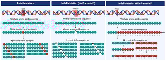 Potential epitopes from different types of mutations. In each panel, DNA is depicted on the top row with a specific type of mutation. The green circles below represent the wildtype amino acids resulting from the translation of the mutant and wildtype DNA sequences. The red circles represent mutated amino acids translated from the mutated DNA. The 9mer epitopes represent all possible 9mer amino acid sequences that contain a mutation, potentially forming a neoantigen. Indel mutations with frameshifts result in sequences of mutated amino acids that continue until premature stop codons are translated. In this example, 18 possible 9mer epitopes were generated from a single frameshift mutation (del:C). del:CAG = deletion of 3 nucleotides; del:C = deletion of one nucleotide; C→T with * represent a point mutation. Created with Biorender.com accessed on 1 January 2023.