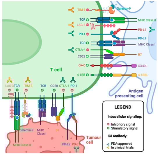 T cell-stimulatory and -inhibitory receptors and ligands. T cells (green cell) may become activated if the T cell receptor (TCR) recognizes and binds a peptide–MHC complex on a dendritic cell (blue cell). However, the costimulatory and inhibitory ligands expressed by the dendritic cell have a profound effect on T cell activation. If the inhibitory ligands on APCs bind inhibitory molecules on T cells (red circle with “−”), the T cell may undergo anergy or cell death. If costimulatory ligands on dendritic cells bind costimulatory molecules on a T cell (green circles with “+”), the T cell may rapidly proliferate and differentiate into anti-tumor cytotoxic T cells (CTL). Once an activated CTL binds its cognate peptide–MHC on a tumor cell (brown cell) it may kill the tumor cell. However, tumor cells may also express inhibitory ligands that inhibit T cell activity when bound to inhibitory molecules on T cells. Blocking this interaction with ICIs releases the breaks on T cell-mediated anti-tumor immunity. ICI antibodies approved in RCC are in green. ICI antibodies under investigation for RCC are in orange. Created with Biorender.com, accessed on 1 January 2023.