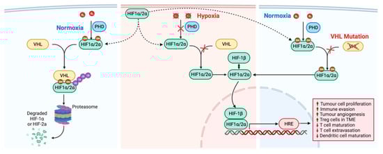 VHL loss leading to HIF stabilization under normoxic conditions. Under normoxic conditions, HIF1/2α is hydroxylated. VHL recognizes hydroxylated HIF1/2α, leading to ubiquitination and proteasome-mediated degradation. Under hypoxic conditions, HIF1/2α is not hydroxylated, disallowing VHL from binding. HIF1/2α is thereby stabilized, binds with HIFβ, and transcribes pro-tumor factors important in various immune-inhibiting and angiogenesis pathways. When VHL is lost through mutations, HIF1/2α is stabilized under normoxic conditions, leading to the pathological transcription of pro-tumorigenesis factors. Arrows indicate movement of molecule; crossed out arrows indicate lost movement of molecule. Created with Biorender.com, accessed on 1 January 2023.