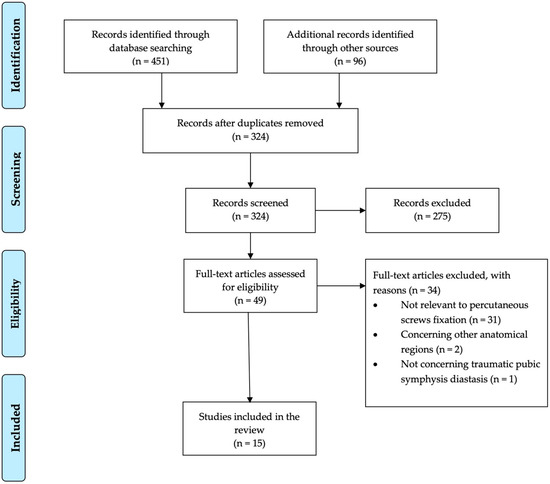The initial database and manual search identified 547 articles, of which 223 were duplicates and 275 were excluded using the titles and abstracts. Finally, 15 articles including six clinical and nine biomechanical studies fulfilled the eligibility criteria and were considered to be relevant for this review. The flow chart of the selection process is presented in Figure 1.