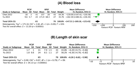 Forest plots demonstrating the mean difference of intraoperative blood loss (A) and length of skin scar (B) between percutaneous cannulated screw fixation (PCSF) reconstruction plate and screws fixation (RPSF). Chen et al. [15], 2012; Yu et al. [2], 2015.