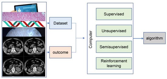 The number of urological cancers such as prostate, bladder, and kidney cancer is increasing every year. Prostate cancer and bladder cancer are the 4th and 10th most common cancers worldwide, respectively, and prostate cancer has become the second leading cause of cancer death in men after lung cancer [3]. With the increasing number of oncology patients and new technologies in the treatment process, doctors are facing a significant load on several elements of cancer management, including pathology, imaging, and treatment. The development of AI to assist clinicians in cancer management has been recognized as an important area of urological medical research. One of the most widely used techniques in the medical field is machine learning (ML). ML is a branch of AI that uses algorithms to automatically identify patterns and trends within the data and select features based on the task [4] (Figure 1). Deep learning (DL) is a subgroup of ML with a neural network architecture that allows models to scale exponentially with the number and dimensionality of data, enabling DL to show outstanding advantages in large-scale data processing, such as image classification and language processing [5]. Numerous published studies have demonstrated that AI has good potential for application in urological cancers, including image-guided diagnostic systems, pathology identification systems, survival prediction models, and tumor progression prediction [6]. A series of relevant prospective clinical trials have been published, showing that AI is not inferior to urologists in clinical performance.
