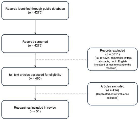 The screening process is shown in Figure 2. After reviewing the type of literature and course content, 51 studies were included in this review.