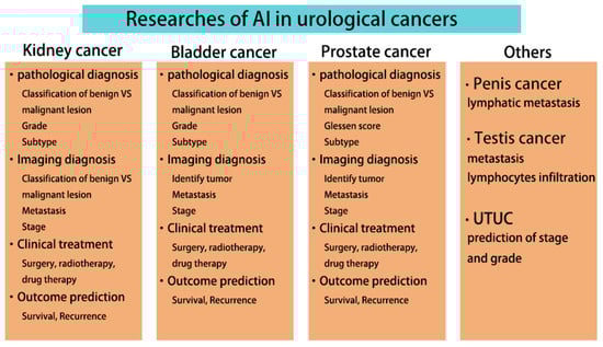 This review summarizes the current status and relevant research on the application of AI in the pathology, imaging, clinical treatment, and prognosis of urological cancers. Moreover, challenges and future directions that target urological cancers are also discussed to improve the applicability of AI in clinical practice.