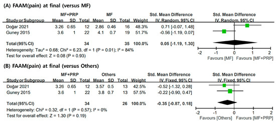 The FAAM instrument evaluates the physical function of individuals with foot- and ankle-related impairments and consists of items such as overall pain, 15 min walking, and running. Figure 4 shows forest plots of pain-related items of the FAAM. Among the studies included in our meta-analysis, three studies [6,28,30] reported the FAAM score; however, only two studies [28,30] provided data suitable for analysis, and these were limited to overall pain. No significant difference was observed between the two groups in the overall pain as measured with the FAAM (pooled SMD = 0.05; 95% CI = −1.19, 1.30; I2 = 84%). Compared to the others group, the MF + PRP group showed no remarkable differences (pooled SMD = −0.35; 95% CI = −0.87, 0.18; I2 = 0%) (Figure 4)