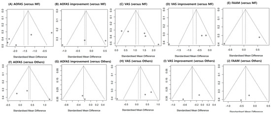 A funnel plot analysis was conducted to assess the publication bias (Figure 6). In addition, Egger’s test was performed for data reported in more than three studies. All factors had a p-value > 0.05 (AOFAS scores compared to MF only, p = 0.0697; improvement in AOFAS scores compared to MF only, p = 0.4057; VAS scores compared to MF only, p = 0.0622; improvement in VAS scores compared to MF only, p = 0.0651; AOFAS scores compared to other procedures, p = 0.4744; VAS scores compared to other procedures, p = 0.1368).