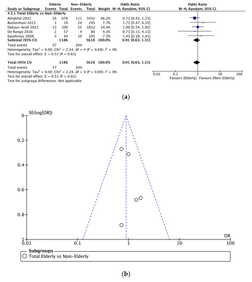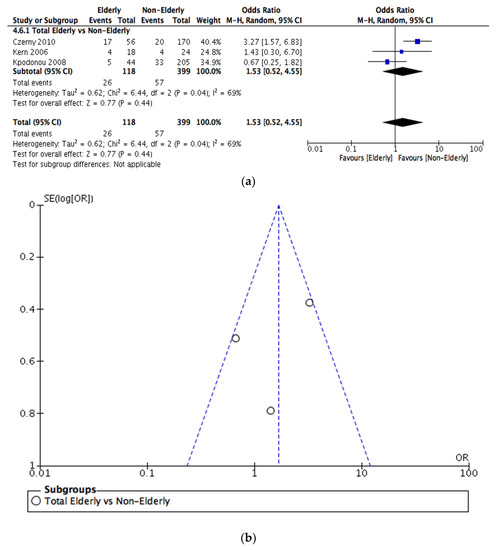 As this endpoint was documented in seven studies for both cohorts, a comparison of short-term mortality was carried out between 1288 elderly patients and 5925 younger patients. Figure 7a shows that short-term mortality favoured the nonelderly population compared to elderly patients (OR = 1.81, [95% CI 1.18–2.76]).