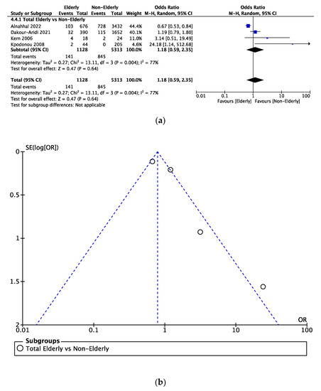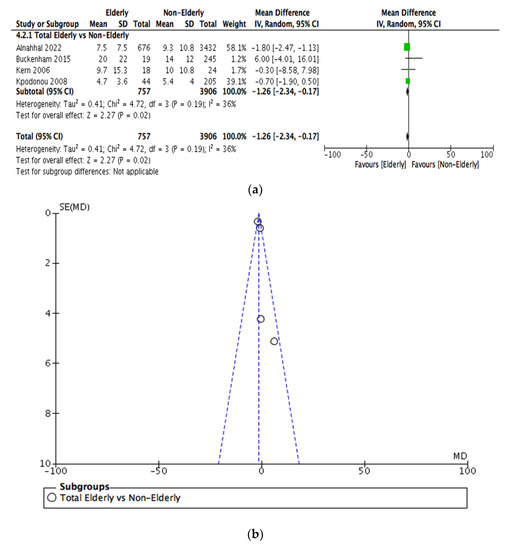 The duration of hospital stay in both age groups was reported in four studies. Hence, 757 elderly patients and 3906 nonelderly were pooled for this outcome. Figure 6a depicts that there was a tendency towards a shorter length of hospital stay in the elderly cohort (OR = −1.26, [95% −2.34 −0.17]).
