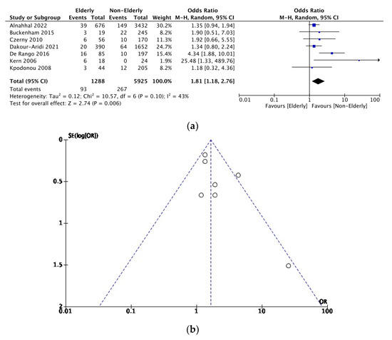(a) Comparison of short-term mortality between elderly vs. nonelderly patients. (b) Funnel plot assessing the publication bias for short-term mortality in elderly patients. References: [3,6,7,12,14,16,18].