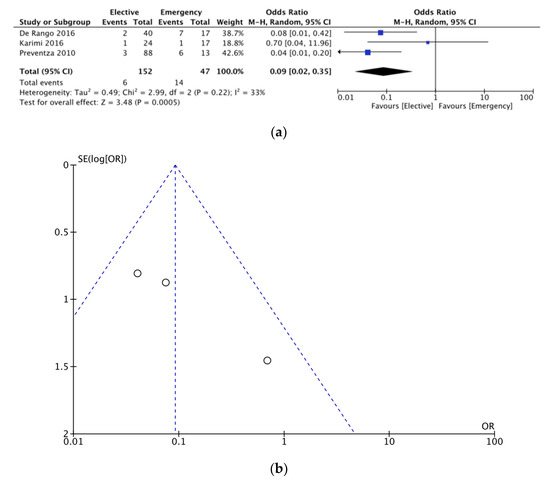The number of studies reporting on elective versus emergency TEVAR procedures in the elderly was three. This translated to a total of 152 patients undergoing elective operations and 47 patients undergoing emergency TEVAR. A comparison regarding short-term mortality between elective and emergency TEVAR procedures in elderly patients revealed a significantly higher mortality in emergency repairs (OR = 0.09, [95% CI 0.02–0.35]) (Figure 8a).