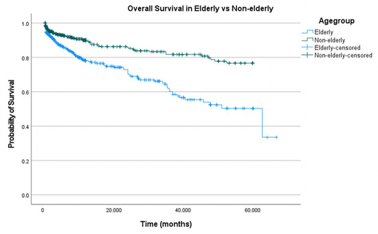 Cumulative Kaplan–Meier curve for overall survival (OS) of elderly vs. nonelderly patients undergoing TEVAR.
