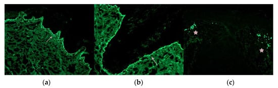 Direct immunofluorescence. Vertical sections: (a,b): Lupus erythematosus: (a) IgG granular deposits at the dermoepidermal junction (arrow) (IgG ×100) and (b) at the interface between the dermis and the follicular epithelium (arrow) (IgG ×200). (c): Lichen planopilaris: Necrotic keratinocytes (Civatte’s bodies) positive for IgM (star) (IgM ×100).