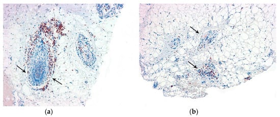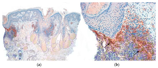 Several histochemical techniques can be employed in the evaluation of alopecia specimens, and some of them are particularly noteworthy []. Periodic acid–Schiff (PAS) and Grocott stains are used to assess alopecia in the context of fungal infections. These stains help visualize the presence of fungal elements within the hair follicles and surrounding tissues. Giemsa stain is utilized to enhance the visualization of premature desquamation (shedding) of the internal root sheath. This can be helpful in identifying specific patterns or abnormalities related to the hair follicle’s structure. Stains used for evaluating elastic fibers [] (orcein and van Gieson) are valuable in identifying patterns that are characteristic of scarring (cradle cap scar in lichen planopilaris, cylinder-like in central centrifugal cicatricial alopecia, etc.). For some authors [], polarized light microscopy is a useful tool in differentiating scars in cicatricial alopecia (which exhibit polarization) from the fibrous trails observed in androgenetic alopecia (which do not exhibit polarization). Other histochemical techniques made popular in recent years which are worth mentioning include the use of CD3 [,] (Figure 4) to identify T lymphocytes in long-standing alopecia areata, the use of CD123 [,] (Figure 5) to detect aggregates of plasmacytoid dendritic cells in cases of lupus erythematosus, and the use of the antitreponemal antibody staining in cases of alopecia associated with syphilis infection.