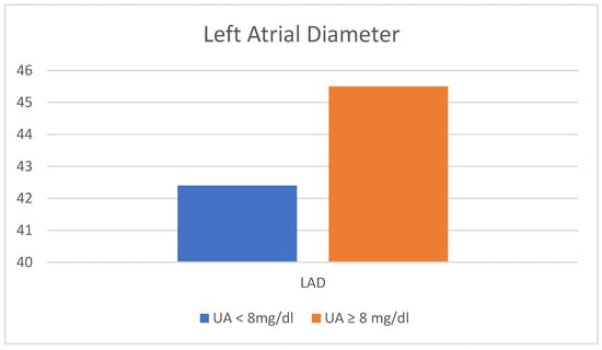 Comparison of the two groups in terms of left atrial diameter. LAD, left atrial diameter; UA, uric acid.