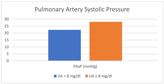 Lastly, in this study, significant insights regarding the relationship between uric acid levels exceeding 8 mg/dL and two variables, specifically left ventricular end-systolic diameter (LVESD) (p = 0.045) and pulmonary artery systolic pressure (PAsP) (p = 0.006), have emerged through the utilization of binary logistic regression analysis with conditional backward steps.