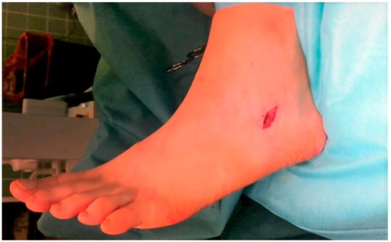 All study surgeries were performed by one of two experienced orthopedic surgeons and were conducted under general anesthesia and regional hemostasis. The patients were positioned prone, and an oblique, 1–2 cm-long incision was made along skin tension lines on the lateral aspect of the foot, at the level of the sinus tarsi, Figure 2.