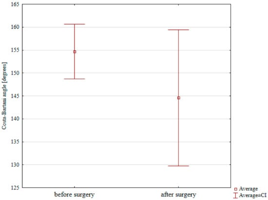 Arbab et al. reported the mean Costa–Bartani angle of 133.1° preoperatively and 129.2° postoperatively [4]. Elmarhgany achieved a reduction in the mean Costa–Bartani angle from 151° to 127° [9]. A group of 68 patients evaluated by de Retana had the mean preoperative Costa–Bartani angle of 144.9° and the postoperative angle of 127.5° [14]. In our study, we achieved a significant reduction in the mean Costa–Bartani angle from 154.66° before to 144.58° after surgery, which is consistent with the data reported in the literature [4,9,14].