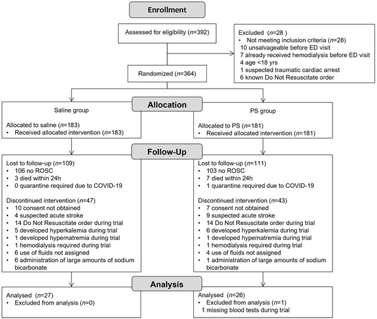 During the trial period, of the 392 potential patients with OHCA, 364 were randomized (183 in the saline group and 181 in the PS group) (Figure 1: CONSORT diagram). The proportion of ROSC cases was 42.1% and 43.1% in the saline and PS groups, respectively (Supplementary File S1: Table S1). After excluding patients who could not adhere to the trial protocol, 27 and 26 patients in the saline and PS groups, respectively, were included in the final analysis.