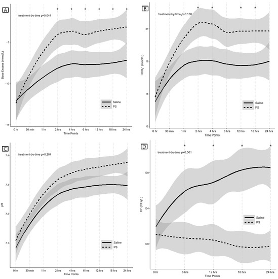 The laboratory results of the two groups are summarized in Table 2, Tables S3 and S4, and Figure 2. At baseline, arterial pH, BE, HCO3−, and serum Cl− levels were not different between the groups. BE was higher at 2, 4, 6, 12, 18, and 24 h in the PS group than in the saline group (p = 0.032, p = 0.036, p = 0.032, p = 0.009, p = 0.009, and p = 0.036, respectively). The increase in BE within the first 24 h was greater in the PS group than in the saline group (p = 0.025). Additionally, the increase in BE from 30 min to 2 h was greater in the PS group than in the saline group (p = 0.044). In the LMM analysis, the change in BE was significantly different between the groups over time (treatment-by-time p = 0.044) (Figure 2A).