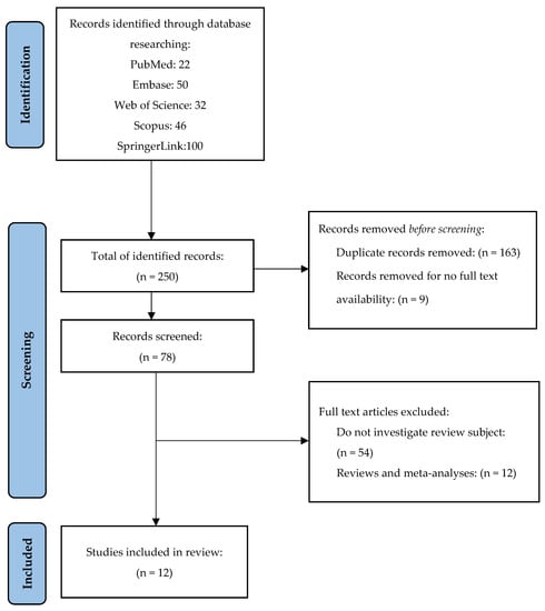 The study selection and data collection were performed by two reviewers and if there were any doubts about the inclusion of the studies, a third one participated in the decision-making process. The titles and abstracts of the selected articles were analyzed in relation to the proposed research topic and, subsequently, the articles considered eligible were fully evaluated based on the inclusion and exclusion criteria. In the first instance, 250 articles were selected from the five mentioned databases in accordance with the search terms previously mentioned. After the initial screening of the selected articles, 163 duplicates and 9 articles without full-text availability were identified and excluded. We did comprehensive research of all databases, libraries, links, and sites through institutional access to find out the full-text availability of the nine excluded articles. Subsequently, 78 articles were analyzed in detail based on the inclusion and exclusion criteria and in relevance to the subject. Out of 78 articles, 12 reviews were identified and eliminated, and 54 articles were excluded because they were not in accordance with the proposed research. After detailed analyses, 12 articles that met the eligibility criteria were selected and included in this review article.