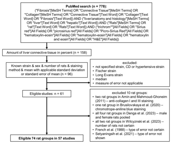 For the estimation of the amount of LCT in healthy Sprague–Dawley and Wistar rats, we ran a Medline search according to Figure 1. Out of the initial 778 studies, where the liver samples were stained either with MT or PSR, in 158 studies, the amount of LCT was shown as a percentage. However, we were able to find both the value of the mean and both the measure of variability of the presented data only in 61 studies; where the data were graphed, we included only the studies with the graphs of sufficient resolution and with clearly visible error bars. Therefore, out of the 57 remaining studies [3,4,11,12,13,14,16,17,18,19,20,21,22,23,24,25,26,27,28,29,30,31,32,33,34,35,36,37,38,39,40,41,42,43,44,45,46,47,48,49,50,51,52,53,54,55,56,57,58,59,60,61,62,63,64], we obtained data for 74 healthy rat groups (we additionally excluded ten rat groups from six studies [4,5,6,7,8,9], details are shown in Figure 1). The datasets analyzed during the current study are available in the GitHub repository, https://github.com/PM-LFP/Biased-assessment-of-rat-liver-fibrosis (accessed on 29 June 2023).