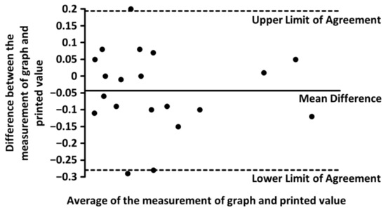 For the precision of the measurements in the published graphs, we used eight studies with 20 data points, where the results were both graphed and printed in text [3,4,5,10,11,12,13,14]. After the measurements of graphs, we compared those results with the data presented in text (Table 1) and checked the distribution of the differences. The Shapiro-Wilk test did not show a significant departure from normality, W(20) = 0.96, p < 0.05. Then, we created a Bland-Altman plot, which did not reveal significant differences between our measurements and the printed values (Table 1, Figure 2).