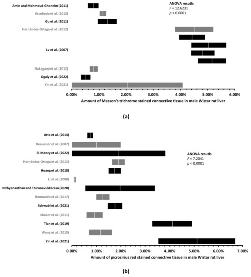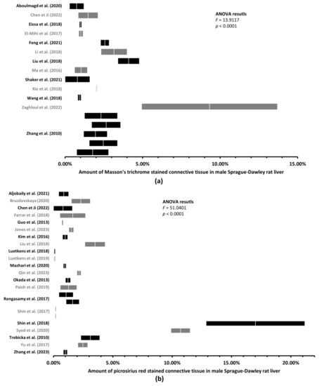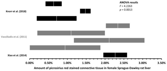 As can be seen in Table 3, the search revealed the mean amount of the rat LCT to yield in male Wistar rats from 0.51% to 5.16% when stained with MT stain and from 0.12% to 5.12% when stained with PSR stain. In male Sprague–Dawley rats, the amount of connective tissue varied from 0.55% to 9.32% when stained with MT and from 0.10% to 17.02% when stained with PSR. For female Wistar rats, our search found only one study [4], where the mean amount of PSR-stained LCT was 0.71%. In female Sprague–Dawley rats, our search revealed one study [17], where the LCT was stained with MT—the mean amount of the connective tissue was 2.08%. In the PSR-stained female Sprague–Dawley rat liver sections, the mean amount of connective tissue varied from 0.64% to 2.34%.