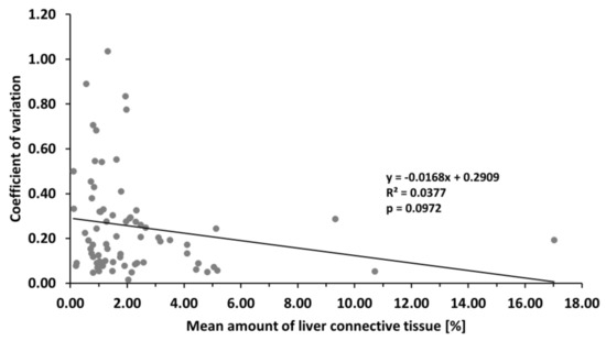 Regression analysis of the mean amount of liver connective tissue and the coefficient of variation. Based on the data retrieved from the eligible studies, the regression line was fitted according to the least squares method. Therefore, with more connective tissue in the liver, there is a tendency toward lowering the variability of the estimated amount of connective tissue. However, the actual changes in the value of the mean amount of connective tissue can explain approximately 3.8% (R2 = 0.0377) of the observed variability.