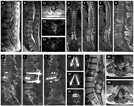 Management of SD with epidural suction–irrigation drainages. (A): A preoperative sagittal T1-weighted fat-saturated contrast-enhanced MR image of the lumbar spine shows spondylodiscitis at the L2/L3 level with epidural spinal empyema at the level of L2 to L5. (B): A preoperative sagittal T2-weighted MR image of the lumbar spine. (C1): Preoperative axial T1-weighted fat-saturated contrast-enhanced MR image of the level L2/L3. (C2–F): Postoperative axial, coronal, and sagittal reformatted CT images showing the placed epidural suction-irrigation drainages cranially and caudally in the spinal canal at the level of L3/L4. (G): Sagittal reformatted CT image showing bone destruction at the level of L2/L3 at 11 weeks at the time of proposed antibiotic discontinuation. (H–K3): Postoperative sagittal, coronal, and axial reformatted CT images showing the result of the single-stage 360-degree instrumentation in a two position. (L–M2): Sagittal and axial T2-weighted MR images displaying the result after stopping the antibiotics.