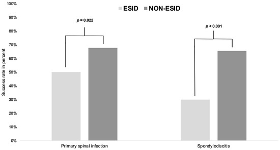 Success rate in patients with primary spinal infection or spondylodiscitis treated with/without ESID. ESID: epidural suction–irrigation drainage group; NON-ESID: group without epidural suction–irrigation drainage; The p-values are significant when p < 0.05, as indicated in the methods according to the Fisher exact test.