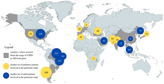 Geographical representation of USPD use in AKI in pediatric and adult populations in different countries. Graphic representation of the data in Table 2.