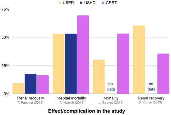 Representation of the effectiveness and associated complications of USPD, USHD, and CRRT in the management of AKI. The chart is constructed using data obtained from Table 3, which includes studies providing sufficient information [35,38,42,86].