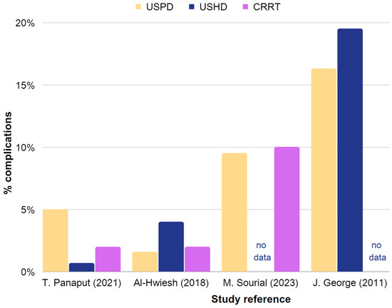 Representation of the occurrence rates of complications in USPD, USHD, and CRRT in AKI. Chart based on the data in Table 3, including studies with sufficient information. The chart is constructed using data obtained from Table 3, which includes studies providing sufficient information [35,42,77,86].