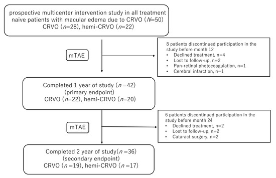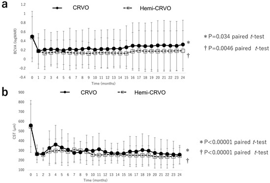 The primary outcome measures were the mean changes in BCVA and CST at month 12. Secondary outcome measures were BCVA and CST at month 24. In addition, we also investigated the number of IVA injections and the number of clinic visits during the 2-year study period. In addition, we examined the time to the first recurrence from the initial IVA injection. Changes in BCVA and CST and the number of clinic visits and injections were compared between eyes with CRVO and those with hemi-CRVO.