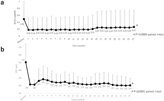 Statistical analysis was carried out using JMP Pro software version 15.1.0 (SAS Institute, Cary, NC, USA). Decimal BCVA was converted to the logarithm of the minimum angle of resolution (logMAR). BCVA and CST were compared with their respective values at the time of the first injection using two-tailed paired t-tests with Bonferroni correction. The efficacy endpoints were analysed in a full analysis set, which included all patients who received any study treatment and had one baseline and at least one post-baseline assessment. Between months 4 and 23, missing data were imputed by the last observation carried forward method. Moreover, we used multivariate analysis to determine whether baseline BCVA, CST, and number of injections were associated with improvements in BCVA and CST at 24 months. A p-value of less than 0.05 was considered statistically significant.