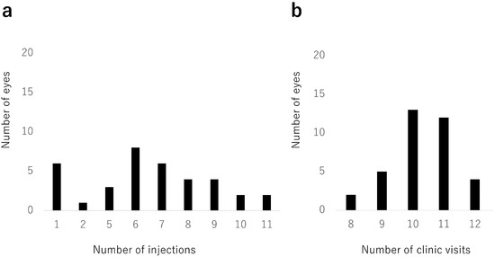 Number of injections and clinic visits. (a) Distribution of numbers of intravitreal aflibercept injections. Six eyes (17%) received only 1 injection. The mean number of intravitreal aflibercept injections was 6.2 (standard deviation, 3.0) during the 24-month study period. (b) Distribution of numbers of clinic visits. The mean number of clinic visits was 10.3 (standard deviation, 1.0) during the 24-month study period.