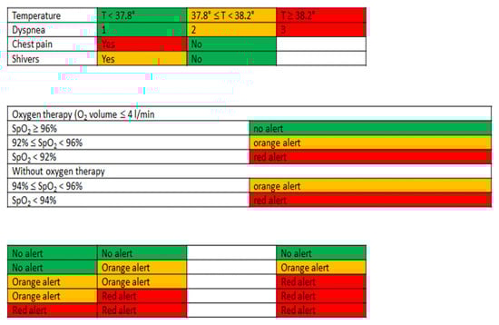 Clinical signs and SpO2 rating for the generation of alerts. One green alert combined with one orange alert generates an orange global alert; two orange alerts generate a red global alert; one red alert combined with one orange alert generates a red global alert; two red alerts generate a red global alert.
