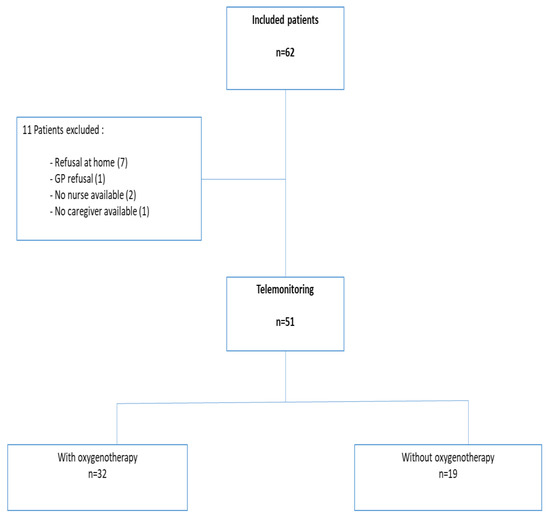 Of the 1834 patients hospitalized in our institution for COVID-19 from November 2020 to August 2021, 62 were included by the regional support platform (PRAG) and 51 were home telemonitored after hospital discharge with My Predi® (Predimed Technology, 667300 Schiltigheim, France) solution. Eleven patients discontinued treatment, mainly due to refusal to continue upon arriving home, or because caregivers were not sufficiently available. Among these 51 patients, 32 (63%) were still receiving nasal oxygen at hospital discharge (Figure 3).