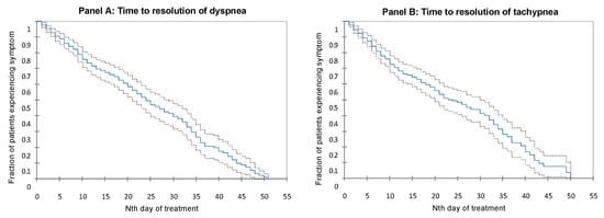 Kaplan–Meier curves showing the time-course of dyspnea (Panel A) and tachypnea (Panel B) resolutions in patients requiring home oxygen therapy. Blue lines show the fraction of patients still presenting dyspnea (A) and/or tachypnea (B) over time and the black lines indicates the 95% confidence interval of time to symptom resolution.