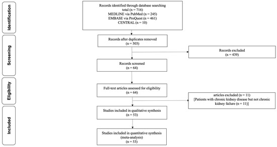 Following the removal of duplicate records, a total of 503 unique records were identified. After the initial screening process, 439 records were excluded based on predetermined criteria, resulting in 64 remaining records. During the secondary screening, 11 studies involving patients with CKD but not CRF (as eGFR ≥ 30 mL/min/1.73 m2) were excluded. Ultimately, a total of 53 studies were included in the analysis for further evaluation and synthesis [13,14,15,16,17,18,19,20,21,22,23,24,25,26,27,28,29,30,31,32,33,34,35,36,37,38,39,40,41,42,43,44,45,46,47,48,49,50,51,52,53,54,55,56,57,58,59,60,61,62,63,64,65]. Of 53 studies, 47 studies reported PON1 activity in CRF patients with and without RRT. Two studies reported paraoxonase activity before and after HD, while four studies reported PON1 activity in CRF patients with and without RRT as well as paraoxonase activity before and after HD.