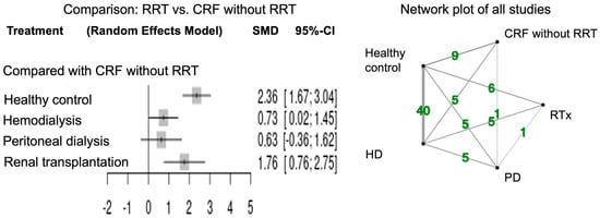 Figure 2 shows the forest plots for network meta-analysis and the network plot of all studies that measured paraoxonase activity. The network meta-analysis of paraoxonase activity was performed in 48 studies. Healthy controls had higher activity relative to CRF patients in accordance with the previous report [7]. Paraoxonase activity was significantly higher in CRF patients with RTx (SMD 1.76; 95% CI, 0.76–2.75) and HD (SMD 0.73; 95% CI, 0.02–1.45) compared to those without RRT. Paraoxonase activity tended to be high in CRF patients with PD compared to those without RRT (SMD 0.63; 95% CI, −0.36–1.62).