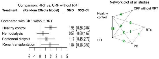 Forest plot and network plots of arylesterase activity in all studies compared with CRF without RRT. Green number indicates the study numbers. CRF, chronic renal failure; RRT, renal replacement therapy.