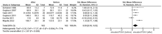 Figure 4 shows the forest plots of paraoxonase activity in CRF patients before and after HD. In the meta-analysis, six studies reported paraoxonase activity in patients before and after HD. Paraoxonase activity was increased after HD (SMD, 0.59, 95% CI, 0.16–1.03) compared to that before HD.