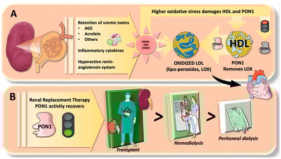 Next, alternative to HD, PD utilizing the patient’s own peritoneum as a filter is a less invasive as a comparatively biocompatible type of RRT, which may show a reduction in oxidative stress mainly due to low pH, high lactate content, high osmolarity, high glucose concentration, and related degradation products [73]. However, because of the high glucose load and the consequent metabolic derangements associated with PD, there is still an elevated risk of CVD with the oxidative burden by this modality [74,75]. Being an HDL-associated molecule, PON1 can be affected by dysfunctional triglyceride-rich lipoprotein catabolism enhanced by the insulin resistance induced by the glucose load [3,4].
