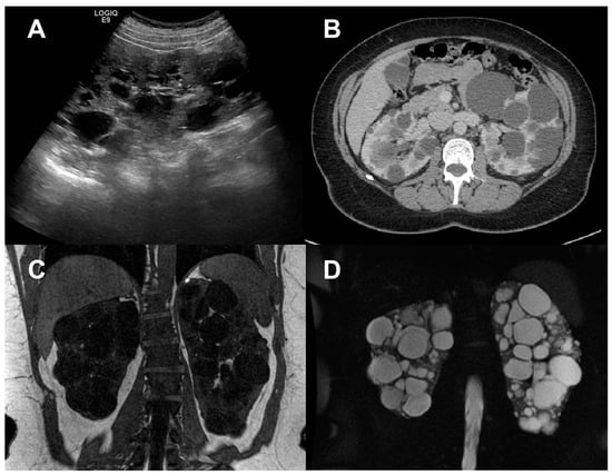 As renal enlargement is the underlying macroscopic process, ultrasonography (US), computerized tomography (CT), and magnetic resonance imaging (MRI) have been used for many years to quantify kidney disease progression in ADPKD (Figure 1) [3,7,8,9,10], recently allowing us to also investigate the relationship between the kidney or cyst volume increase, and renal function decline in the polycystic kidney [11,12,13].